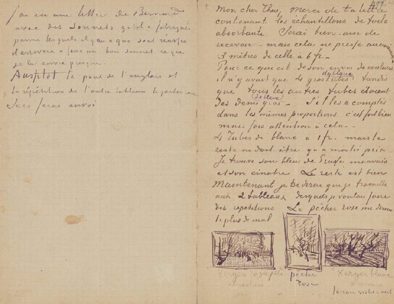 Letter from Vincent van Gogh to Theo van Gogh with sketches of Three Orchards (recto)