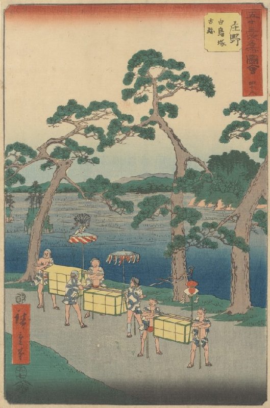 Shōno: De overblijfselen van de grafheuvel van Shiratori, nr. 46 uit de prentenserie Verzameling afbeeldingen van beroemde plaatsen bij de drieënvijftig stations [langs de Tōkaidō]