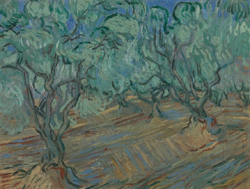 In Saint-Rémy hoefde Van Gogh maar een paar stappen buiten de muren van de inrichting te zetten of hij stond middenin een olijfgaard. Daar zat hij vaak te schilderen. Dit is een studie in olieverf die hij daar maakte.