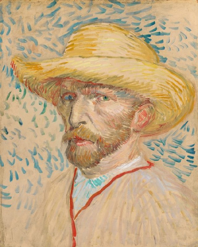 In lichte zomerse kleding kijkt de kunstenaar ons onderzoekend aan, met één blauw en één groen oog. Voor dit zelfportret gebruikte Van Gogh een goedkope drager: karton. Daarop bracht hij een onderlaag aan met paarse strepen. Het pigment daarin is echter in de loop der tijd sterk verbleekt. Op de schouderpartij zijn nog wat vage roze strepen te zien. Van Goghs zorgvuldige kleurenopbouw is daarmee verloren gegaan. Oorspronkelijk contrasteerde de paarse achtergrond bijvoorbeeld met zijn gele strohoed.