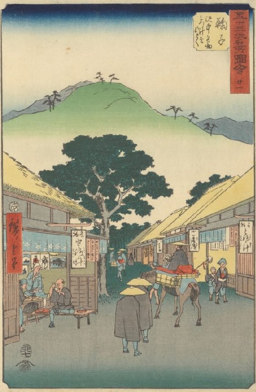 Mariko: The Selling of the Local Yam Soup Specialty at the Station, no. 21 from the series Collection of Illustrations of Famous Places near the Fifty-Three Stations [Along the Tōkaidō]