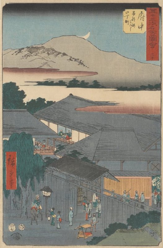 Fuchū: The Second Block of the Miroku Quarter near the Abe River, no. 20 from the series Collection of Illustrations of Famous Places near the Fifty-Three Stations [Along the Tōkaidō]