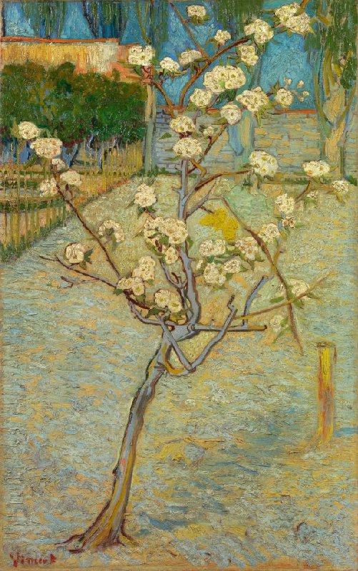 The gnarled trunk and branches of this small pear tree stand out against the light background. Van Gogh was captivated by the flowering fruit trees in Provence, so he made a whole series of paintings of trees in blossom.