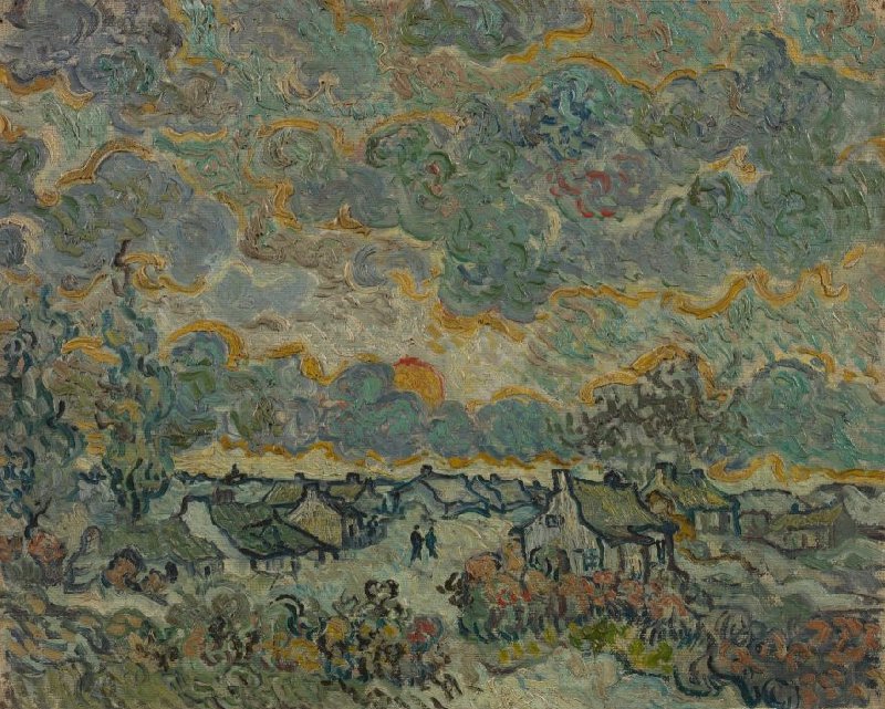 This landscape was painted during one of Van Gogh's difficult periods. He was in the hospital in Saint-Rémy. When he had to stay indoors but wanted to paint, he had to find subject matter. For example, he painted several 'reminiscences' of his native Brabant region. He wrote about them in a letter to his mother and sister: 'And while my illness was at its worst, I still painted, among other things a reminiscence of Brabant, cottages with mossy roofs and beech hedges on an autumn evening with a stormy sky, the sun setting red in reddish clouds.'