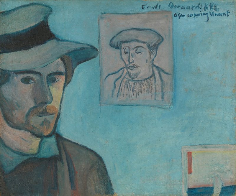 Van Gogh had asked his two friends to make portraits of each other. But Bernard didn’t dare: he was only 20 and intimidated by Gauguin, who was twice his age. So each of them sent a self-portrait featuring a sketch of the other. Beside his signature, Bernard wrote a dedication to his friend (‘copain’) Van Gogh. The added ‘g’ at the end of ‘copain’ was a joke about the local accent in Provence, where Van Gogh was living.