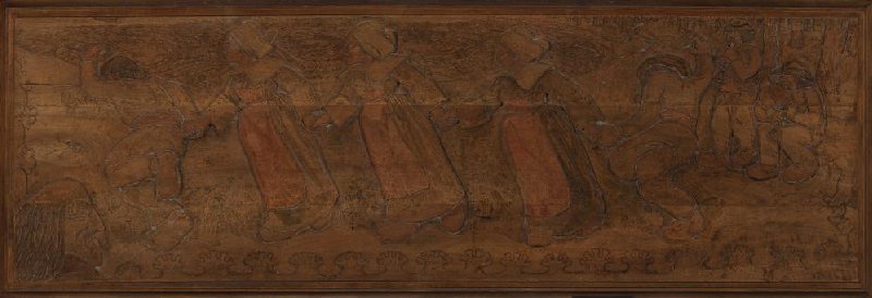 On this enormous piece of wood Lacombe carved a traditional dance from Brittany. The dancers form a graceful line against a coastline of decorative waves and aquatic plants. Lacombe was inspired by what he saw as the ‘pure’ life of people living in the countryside, still untouched by modern industrial developments. Overall, the scene has a certain naivety, just as Lacombe intended.