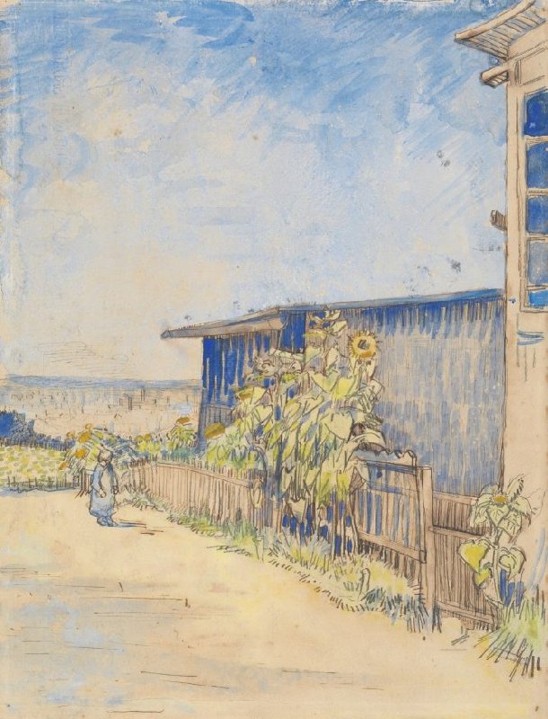Van Gogh koos voor deze tekening een plek tussen de moestuintjes op de noordwestelijke helling van Montmartre. De hoge schuur en het lagere gebouwtje stonden aan de rand, daarachter lagen de buitenwijken van Parijs met hun fabrieken.