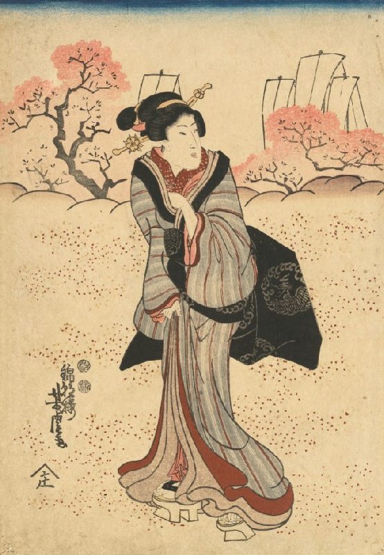 Drie vrouwen met zeilen en kersenbloesems, linkerblad van triptiek