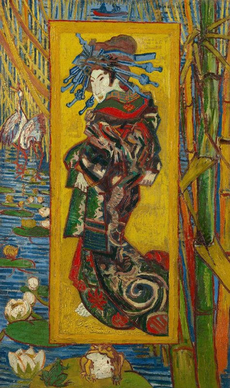 Dat ze een courtisane is, een vrouw van lichte zeden, is te zien aan haar haardracht en aan de ceintuur (obi). Deze is niet aan de achterkant, maar aan de voorkant van haar kimono vastgeknoopt. Van Gogh omlijstte haar met een vijver vol waterlelies, bamboestengels, kraanvogels en kikkers. Daarin school een verborgen betekenis: grue (kraanvogel) en grenouille (kikker) waren in Frankrijk populaire synoniemen voor prostituees.